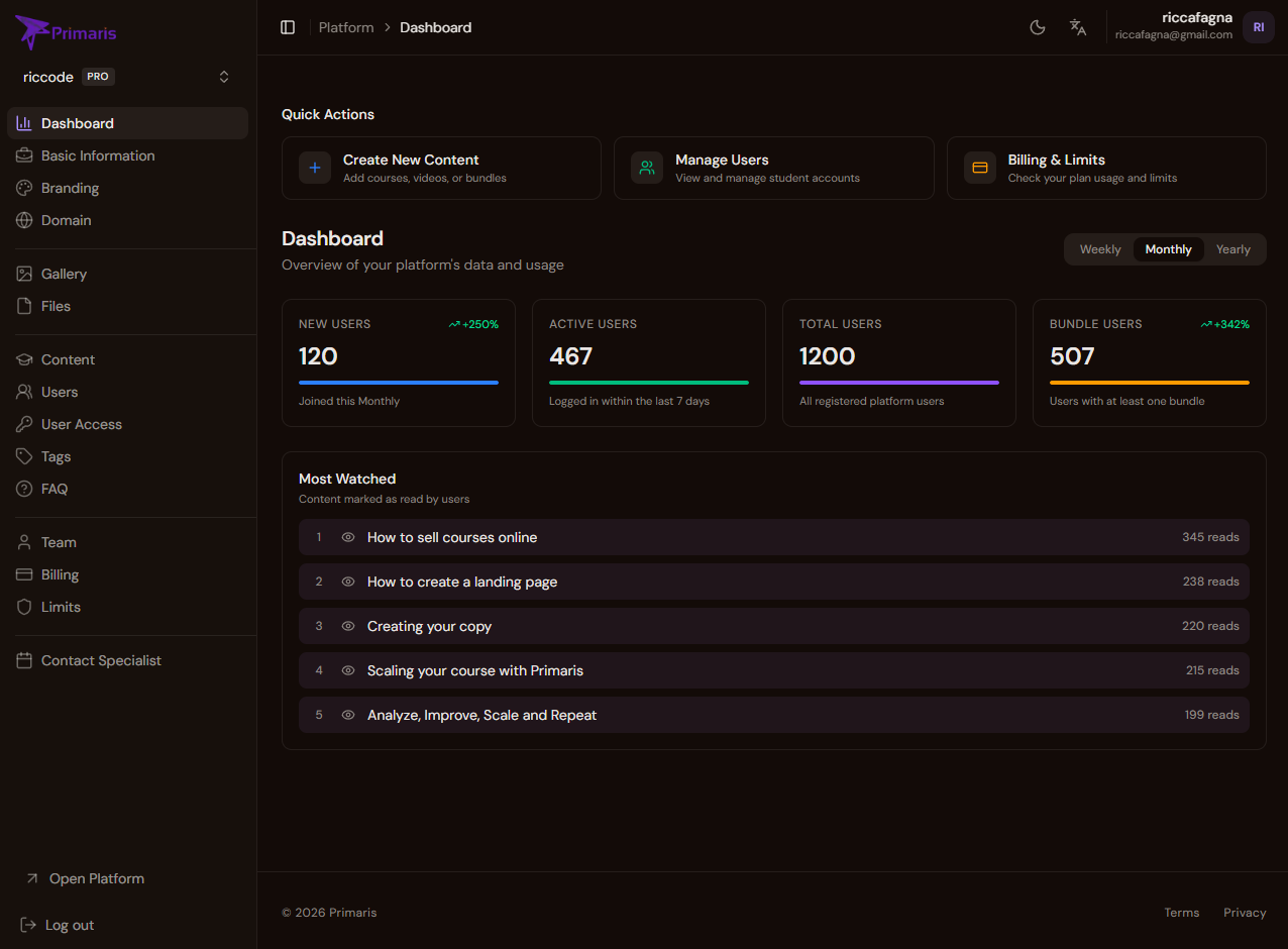 “Prima pagavo una piattaforma 20 volte più costosa per lo stesso risultato. Con Primaris ho migrato oltre 10 anni di contenuti e migliaia di utenti senza problemi. Sono con loro da più di un anno e non ho mai sentito la necessità di cambiare.”